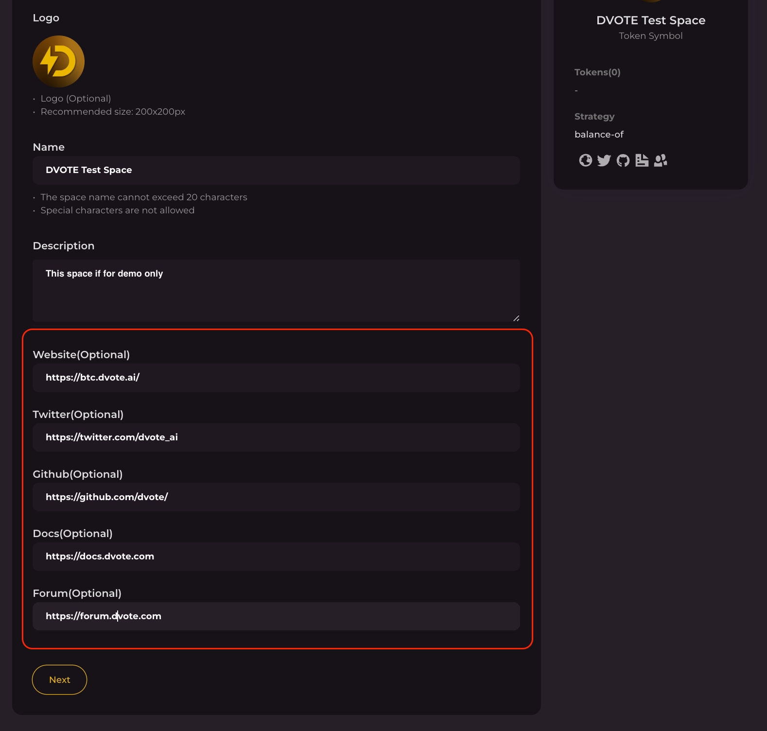 You can add extra information to your space, like links to your official website, Twitter (now called X), GitHub, documentation, and forums.