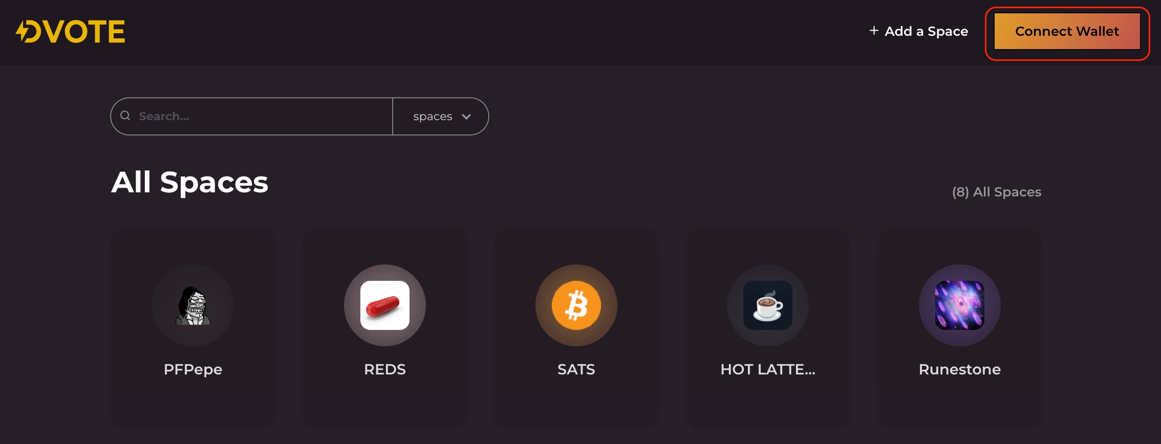 To begin, go to btc.dvote.ai for Bitcoin, evm.dvote.ai for EVM networks, or sol.dvote.ai for Solana Ecosystem. Click on the Connect Wallet button located at the top right corner of the homepage. Select your wallet provider from the list.