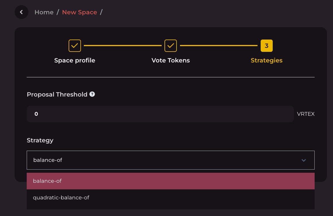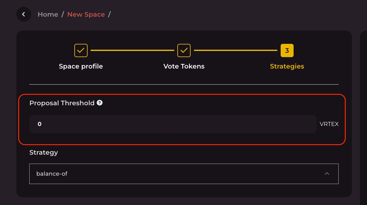 In the example below, the threshold is set to 0. This means anyone can create a proposal, even if they don't have any VRTEX tokens.